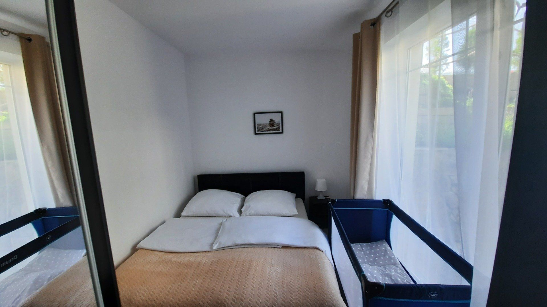 - ein abschliessbares kleines Schlafzimmer mit Doppelbett mit Platz für ein Babybett
