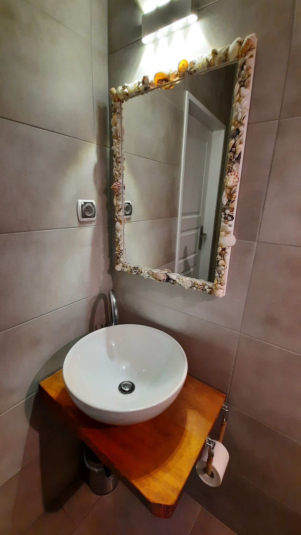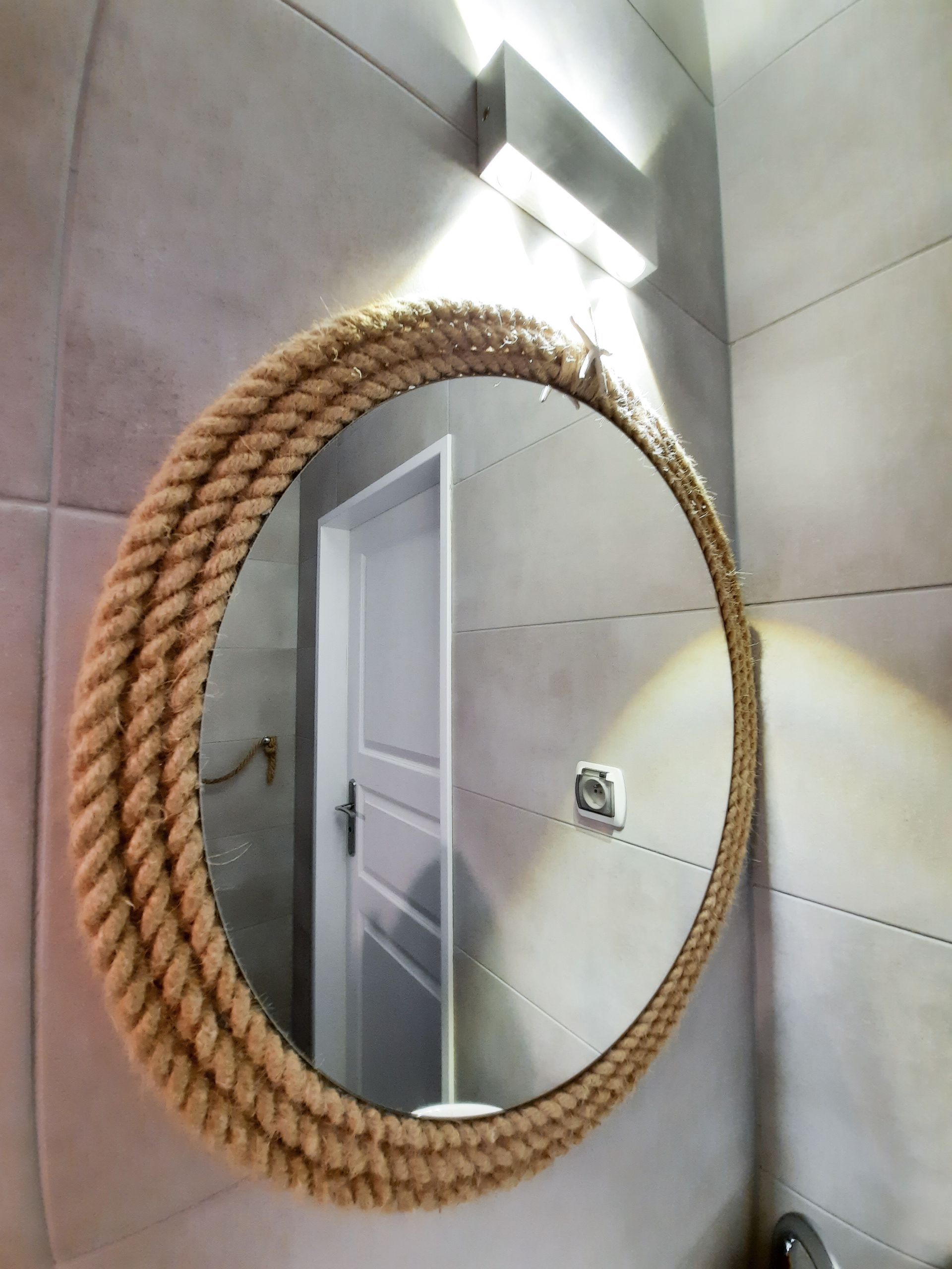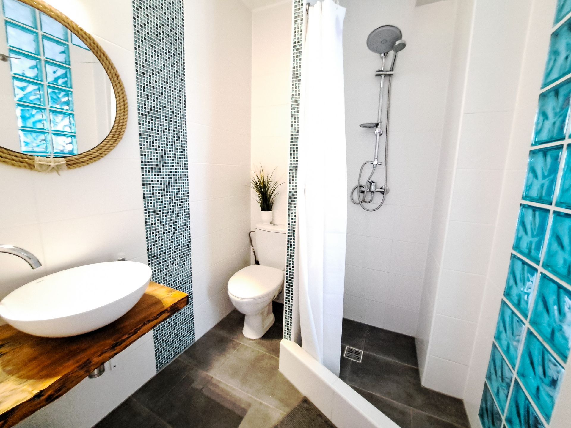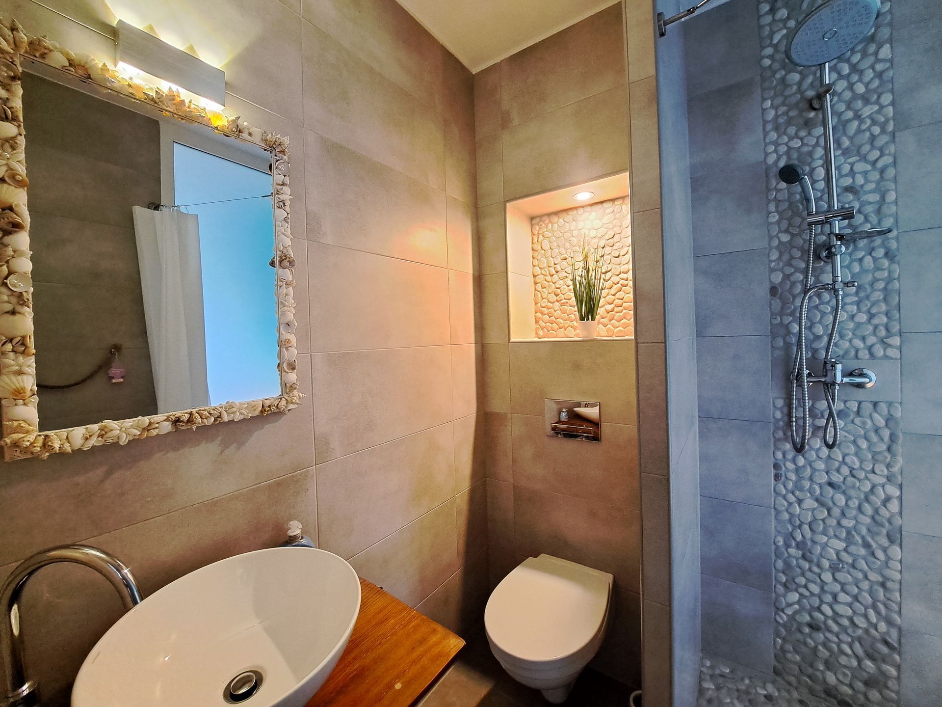 - nowoczesna łazienka, której atutem jest dostęp do dziennego światła dzięki wbudowanym luksferom oraz prysznic ze strumieniem deszczowym